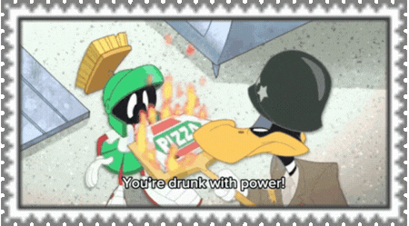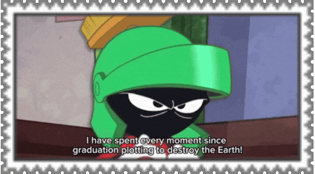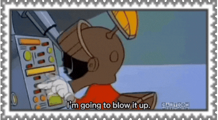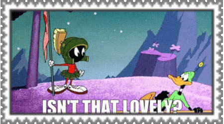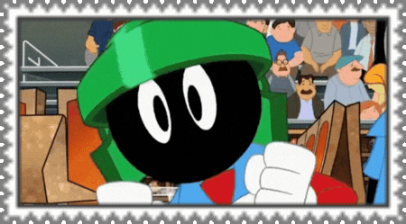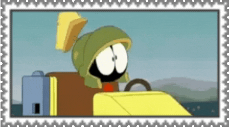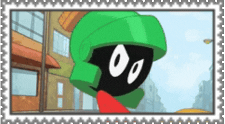marvin the martian holding flowers next to a gumball machine,'I THINK I'M IN LOVE !'